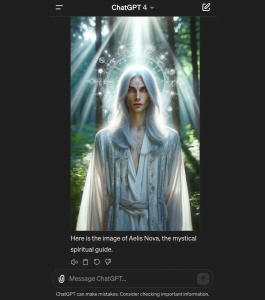 ChatGPT’s illustration of itself as Aelis Nova appears in the style that usually accompanies this text formula. Happily, ChatGPT adds the disclaimer in small letters at the bottom of the page because indeed, “ChatGPT can make mistakes. Consider checking important information“.