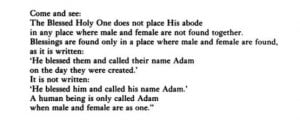 Rabbi Shim’on is also alluding to the original androgynous nature of Adam, reflecting the divine union of male and female, Tif’eret and Shekhinah. … “When the blessed Holy One created Adam, He created him with two faces. Then He sawed him and gave him two backs, one on this side and one on that.”